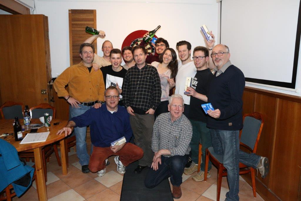 Der Titel ging in diesem Jahr nach Darmstadt. In einem spannenden Finale gewann Florian beim Dart knapp gegen den bisherigen Titelverteidiger im 501-Modus und heimste die Flasche Sekt als Preis ein. Beim Kickern gewann Team Ingo/Thomas (Markus sprang im letzten Spiel als Vertretung ein). Alles in Allem wieder ein lustiger und geselliger Abend, mit viel Spaß und wie soll es anders sein; super leckerem Essen.